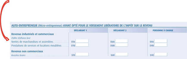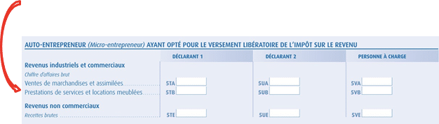 Indiquez le chiffre d’affaires brut (avant abattement) dans la case 5 TB ou 5UB (conjoint) si vous êtes micro-entrepreneur ou, en page 3, 5KP ou 5LP (conjoint) si vous relevez du régime microentreprise. Le centre ds impôts déduira ensuite l’abattement afin de déterminer la base imposable.